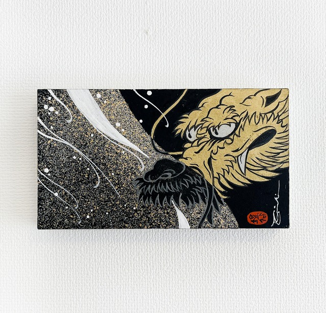 金龍黒龍 S-16 パネルに和紙を貼り龍を描きました。 横向きでも縦向きでも飾っていただけます。 一つづつ心を込めて描いた一点限りの龍画です。 全て塩谷榮一の手描き、肉筆になります。 素材:和紙、墨 等 パネルサイズ:MOサイズ 180mm 100mm ※色味は写真の見え方により違う場合があります ※肉筆ですので色むらカスレなどがあります
