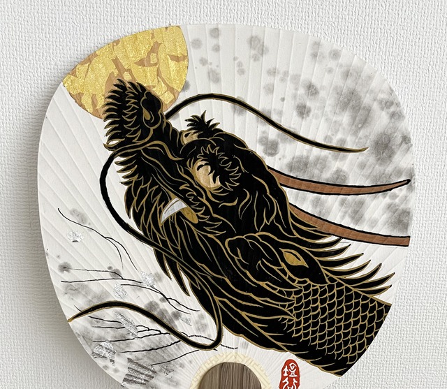 肉筆 白龍うちわ(金箔銀箔)