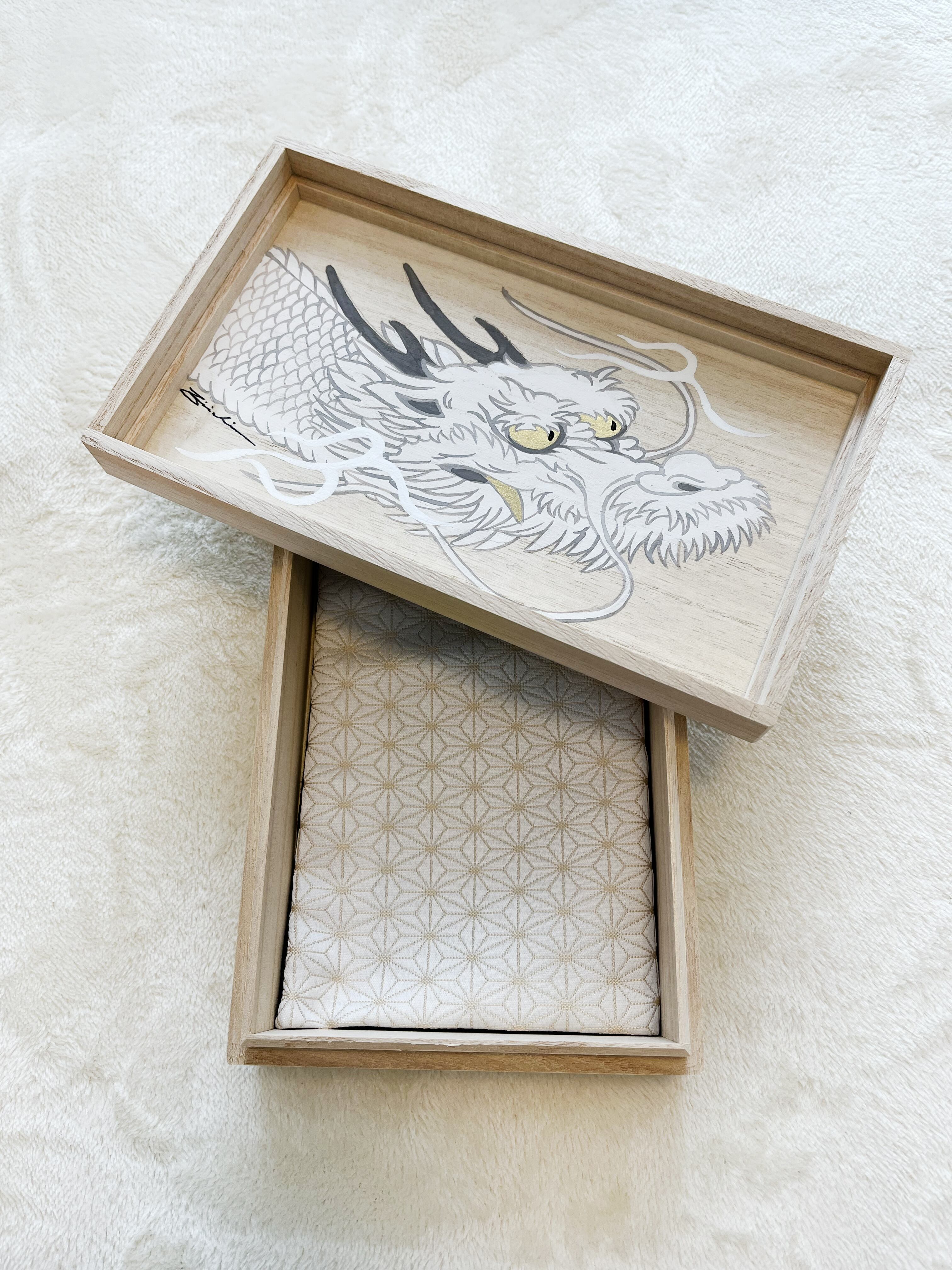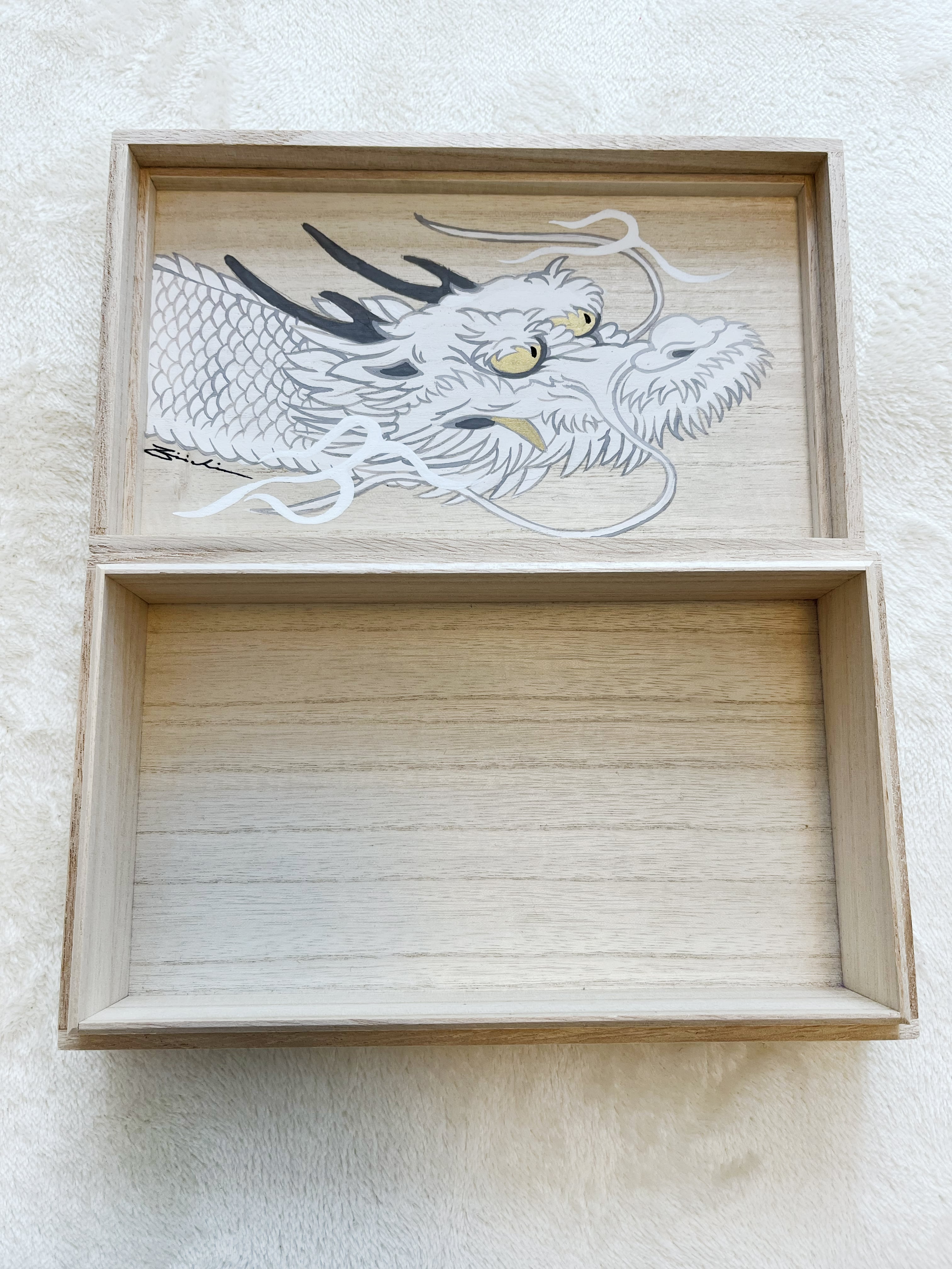 ふたの表面に葵と龍文字を描き、ふたの裏面には白龍を描いています。